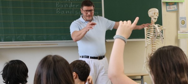 Als gegen Ende der Stunde der Orthopäde die Kinder noch dazu einlädt, ihm Fragen zu stellen, bricht sich deren Wissbegierde vollends Bahn. „Warum können wir nicht ohne zu sterben leben?“, fragt ein Junge in der ersten Reihe. Dr. Jäger hält kurz inne: „Da stellst Du aber eine ziemlich große Frage“, erwidert er und sucht kurz nach einer passenden Antwort. Der Mediziner spricht nun von der Vergänglichkeit und Begrenztheit allen Lebens. Eine Mitschülern will wissen, warum man seine Finger knicken könne, das bei den Beinen aber nicht so gut funktioniere.