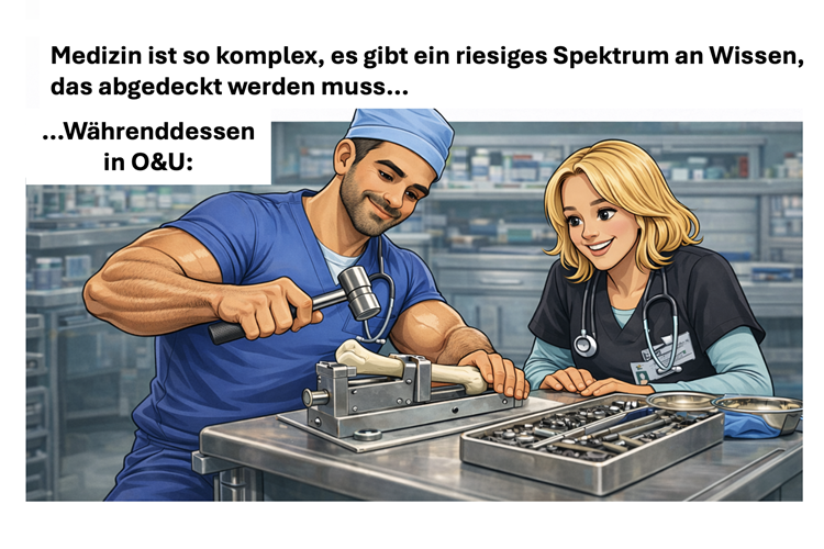 Für viele Medizinstudierende beginnt der erste Kontakt mit der Orthopädie und Unfallchirurgie (O&U) heute nicht im Hörsaal, nicht im OP und nicht während einer Famulatur, sondern bereits auf dem Smartphone. Ärztinnen und Ärzte in O&U sind dargestellt als grobe Handwerker, ausgestattet mit Hammer, Meißel oder Bohrmaschine, begleitet von lauter Musik, Muskelposen oder sportlichen Anspielungen.