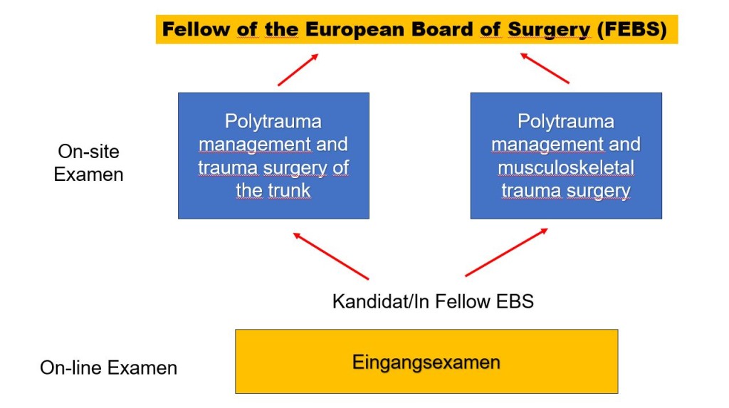 Die Division für Trauma Chirurgie wurde 1999 gegründet unter dem Dach der chirurgischen Sektion. Sie vertritt die eigenen Interessen unserer Subspezialität. Das Board der Division zählt zurzeit 8 Mitglieder und besteht aus Vertretern von nationalen berufs- und wissenschaftlichen Gesellschaften aus 6 Ländern. Dieses Board hat im vergangenen Jahr die Zulassungskriterien für die Kandidaten des Europäische Trauma Chirurgie Examens neu aufgestellt. Das neue Format ist aus der Erkenntnis entstanden, das nur noch sehr wenig junge Chirurgen eine breite chirurgische Erfahrung vorweisen können, die Trauma Chirurgie des Thorax, Abdomen und Skelett umfasst. Das Examen (European Board of Surgery Qualification Examination in Trauma Surgery; EBSQ Trauma Surgery) wurde deshalb in zwei gleichwertige Module aufgeteilt. Nach einer Eingangsprüfung, die online abgehalten wird, kann der erfolgreiche Kandidat / die erfolgreiche Kandidatin sich entscheiden zwischen zwei Module „Polytrauma Management and Trauma Surgery of the Trunk“ oder „Polytrauma Management and Musculoskeletal Trauma Surgery“. Diese Examina werden on-site organisiert. In beide Module wir der Schwerverletztenerstversorgung viel Aufmerksamkeit gewidmet. Wer einer dieser Module bestanden hat, bekommt das Zertifikat „Fellow of the European Board of Surgery (FEBS)“.