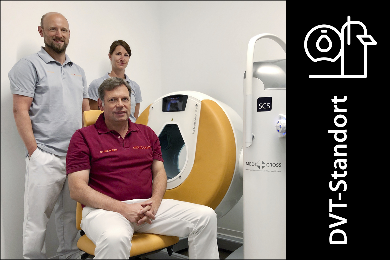 Seit Juli 2020 verfügt das MediCross Neckarsulm über die BVOU-Edition des SCS DVTs, das hochauflösende 3-D-Schnittbildaufnahmen – auch unter natürlicher Belastung der Gelenke – anfertigt. Auf dem Bild zu sehen (v.l.n.r.): Nils Haupt, Dr. med. Boris Brand, Dr. med. Anne-Catherine Oppermann
