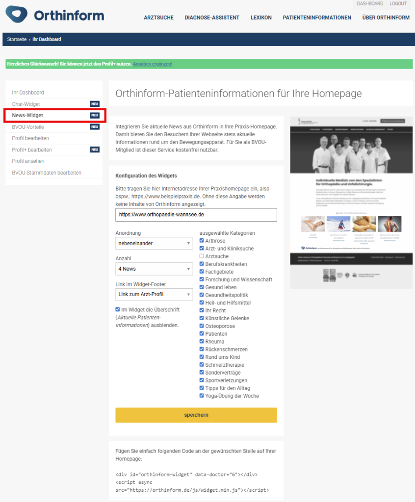 Neben dem Chatbot OrthoChat können bereits seit langem die neuesten Beiträge von Orthinform in die eigene Webseite einfließen. Das funktioniert ähnlich unkompliziert wie die Aufschaltung des Chatbots in die Praxishomepage. Unter dem Menüpunkt „News-Widget“ können die Parameter für die Darstellung der News-Beiträge festgelegt werden, beispielsweise wie viele Einträge in einer Zeile nebeneinander abgebildet werden sollen. Außerdem können Themen ausgewählt werden, aus denen sich die neuen Beiträge zusammensetzen sollen. So lassen sich genau die Spezialisierungen herauspicken, die mit der eigenen Praxis oder Klinik assoziiert werden sollen. Nach dem Klick auf „Speichern“ wird auch hier wieder ein Stück HTML-Code generiert, das selbst oder durch die Homepagebetreuung in die Praxiswebseite eingebaut werden kann. Unmittelbar danach werden dann automatisch die neuesten Beiträge von Orthinform auf der eigenen Webseite eingeblendet.