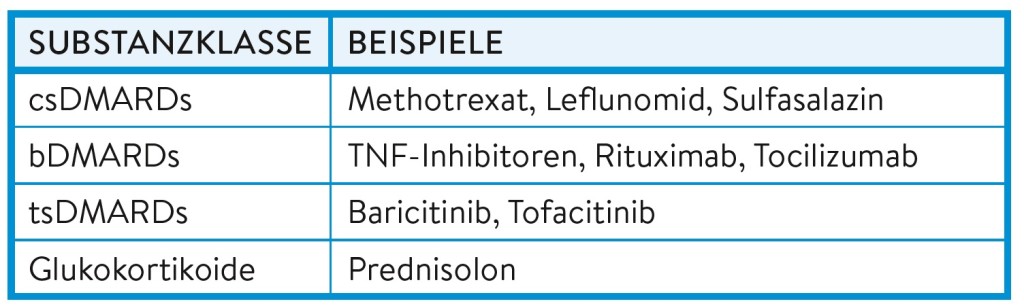 Moderne Therapieansätze kombinieren konventionelle synthetische DMARDs (csDMARDs) wie Methotrexat oder Leflunomid mit Biologika (bDMARDs) oder zielgerichteten synthetischen DMARDs (tsDMARDs), z. B. JAK-Inhibitoren. Die Wirkung dieser Medikamente beruht auf einer Modulation der Immunantwort – sie reduzieren effektiv die Krankheitsaktivität, aber auch die Fähigkeit zur Infektabwehr. Häufig werden auch weiterhin Glukokortikoide als begleitende Therapie verabreicht, häufig in Kombination mit Immunsuppressiva, um die Wirkung zu verstärken beziehungsweise die Dosis zu verringern.