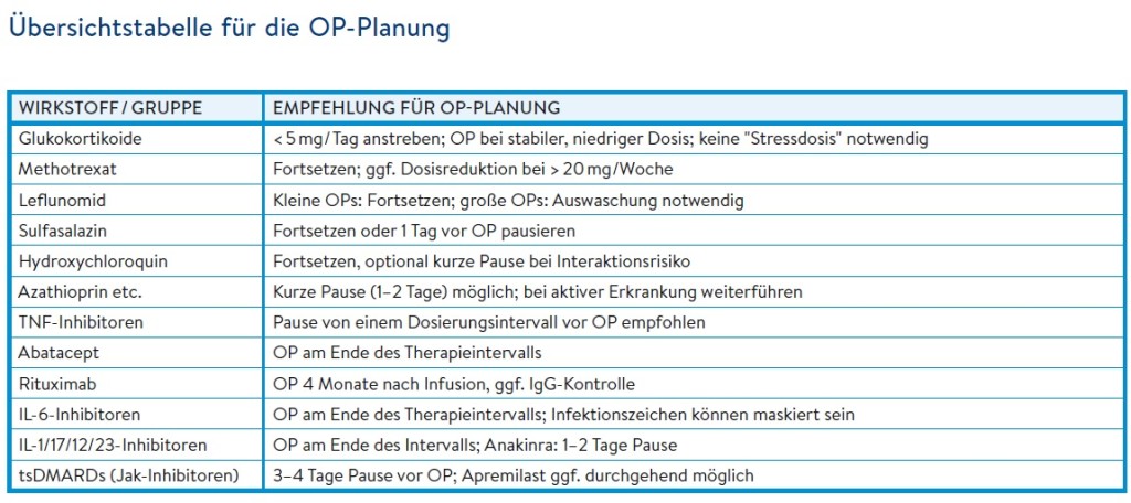 Für Operateure besonders relevant: Alle drei Medikamente haben kurze Halbwertszeiten (Azathioprin: 4–5 h, Ciclosporin A: 5–10 h, Mycophenolat: ca. 16 h). Eine kurzfristige Pause von 1–2 Tagen vor einem elektiven Eingriff führt in der Regel zu keiner signifikanten Beeinflussung des perioperativen Verlaufs. Die immunsuppressive Wirkung kann zwar über diesen Zeitraum hinaus bestehen, klinisch relevante Auswirkungen auf die Wundheilung oder Infektionsrate sind bei kurzer Unterbrechung jedoch nicht zu erwarten. Gleichzeitig bleibt das Risiko eines rheumatischen Schubs bei dieser Vorgehensweise gering. Eine Weiterführung der genannten Immunsuppressiva ist bei stabiler Krankheitskontrolle in der Regel möglich.