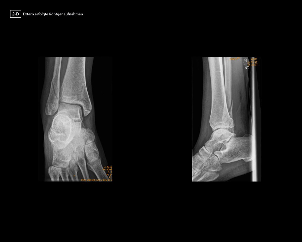 Vor den genannten Hintergründen ist das SCS DVT in der ATOS Klinik Wiesbaden fester Bestandteil des Diagnostikspektrums und wird auf Basis der beschriebenen Strahlenhygiene häufig mit dem SULD-Protokoll als Primärdiagnostik angewendet. Der Autor kann auf mehr als 11 Jahre Anwendungserfahrung zurückgreifen und von unzähligen Fällen berichten, in denen das DVT die entscheidenden Informationen zur Therapieplanung beigetragen hat. Beispielhaft soll dazu nachfolgend ein Fall vorgestellt werden. In dem dargestellten Fall zeigten die extern angefertigten 2-D-Röntgenbilder einer 27-jährigen Frau nach einem Distorsionstrauma eine Mehrfragmentfraktur der distalen Fibula mit fraglicher Beteiligung der Syndesmose, eine Fraktur des hinteren Volkmanndreiecks <1/4 der Gelenkfläche, sowie eine Fraktur des medialen Malleolus. In der AP-Projektion kommt eine Aufhellungslinie im Bereich der medialen Tibia zur Darstellung, die nicht exakt zuzuordnen ist und in der seitlichen Ebene kein entsprechendes Korrelat zeigt (Abb. 1).