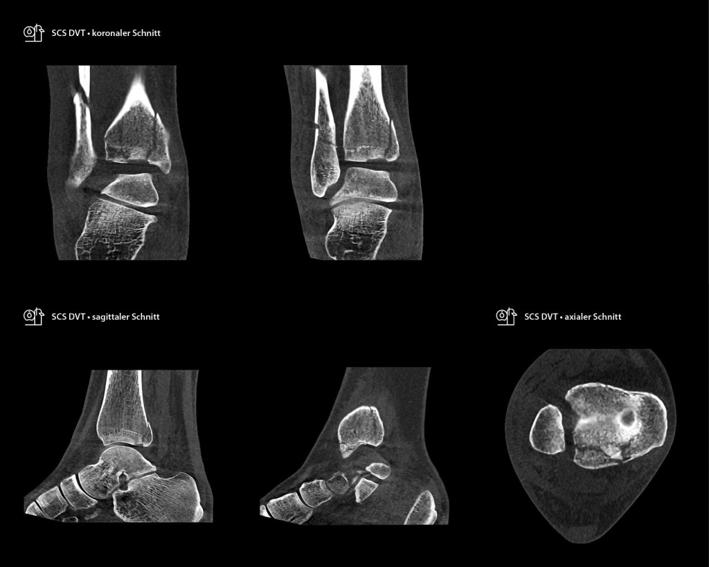 Der digitale Volumentomograph SCS MedSeries® H22 ermöglicht eine sofortige adäquate Bildgebung mit der Darstellung in 2-D, 3-D und Schnittbildern bis zu einer Schichtdicke von 0,2 mm. Dabei wird der Patient einer effektiven Strahlendosis ausgesetzt, die im SULD-Protokoll unterhalb der Exposition eines 2-D-Röntgens in 2 Ebenen liegt. Diese exakte Diagnostik in der Hand des DVT-fachkundigen Orthopäden, Chirurgen und Unfallchirurgen im Rahmen von Verletzungen führt zu einer unmittelbar verfügbaren Diagnose, auf deren Basis schnellstmöglich eine optimale Therapie eingeleitet werden kann. Im klinischen Verlauf ermöglicht die dieses Diagnoseverfahren eine exakte Beurteilung der Durchbauung der Frakturen, da die entsprechenden Algorithmen eine artefaktarme Darstellung der Implantate samt Beurteilung der Grenzflächen ermöglicht.