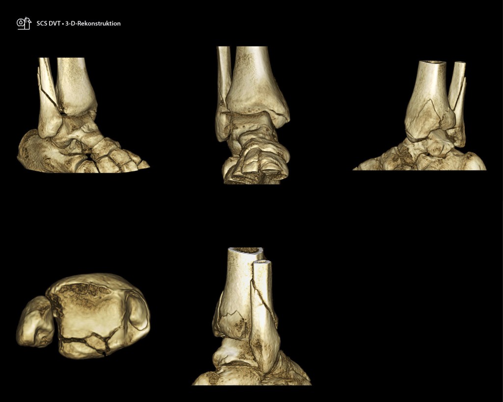 Die Untersuchung mit dem SCS DVT zeigte einen gravierenderen Befund, der auch Einfluss auf die Indikation des operativen Verfahrens hat. Es bestätigte sich die Mehrfragmentfraktur der distalen Fibula, sowie die Innenknöchelfraktur. Entscheidend ist aber die Möglichkeit der exakten Beurteilung der dorsalen Frakturen der Tibia. Diese sind aufgrund der Summation im konventionellen Röntgen nicht zu erkennen gewesen. Neben der Fraktur des Volkmann-Dreiecks mit entsprechender Instabilität der dorsalen Syndesmose zeigt sich eine Impression eines Gelenkfragmentes und eine Fraktur der dorsomedialen Tibia (Abb. 2–4). Die gesamte effektive Strahlendosis betrug 1,5 μSv für das 2-D-Röntgen + 1,4 μSv für das DVT im SULD-Protokoll, insgesamt 2,9 μSv. Bei einer konventionellen CT-Untersuchung wären es 1,5 μSv + 21,4 μSv = 22,9 μSv gewesen. Bei einer sofortigen Untersuchung mit dem DVT hätte die Dosis 1,4 μSv betragen. Aufgrund dieser komplexen Verletzungsmuster bestand die Indikation zur Operation in Bauchlage zur Versorgung der dorsalen Frakturen der Tibia und Fibula über einen dorsolateralen Zugang sowie perkutan zur Verschraubung des medialen Malleolus.